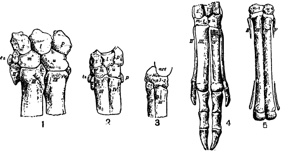 1 — аноплотерий; 2 — ксифодон; 3 — задняя нога гиемосха; 4 — передняя нога гиемосха; 5 — передняя нога гелока. Видны изменения в расположении и размерах косточек запястья и предплюсны (s, m, n, t и др.). (Из монографии В. Ковалевского об антракотерии).