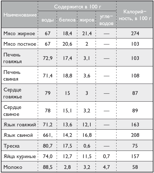 Основой рациона взрослой собаки являются продукты животного происхождения. Они характеризуются высоким содержанием белка, жиров, содержат минеральные соли и воду, хорошо усваиваются организмом собаки. К продуктам животного происхождения относятся мясо, субпродукты, рыба, животные жиры, молоко и молочные продукты. Питательность и состав некоторых продуктов животного происхождения представлены в таблице ниже.