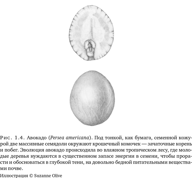 Прорастание включает в себя множество химических реакций, так как после состояния покоя запускается активный обмен веществ, синтезируются все гормоны, ферменты и другие вещества, необходимые для превращения питательных запасов семени в ткани нового растения. У авокадо эти запасы богаты и разнообразны — от крахмала и белка до жирных кислот и сахаров, — так что в питомниках нет необходимости вносить в почву удобрения, пока саженцы не подрастут. Пересаживая свои молодые деревца в почву для горшечных культур, я заметил, что у каждого из них семядоли все еще крепко держатся у основания стебля подобно паре ладоней. В течение многих месяцев и даже лет после того, как у молодых деревьев авокадо появились корни и листья, они все еще могут почерпнуть частицу энергии из «завтраков», приготовленных их «матерями». Такая щедрая забота авокадо о потомстве имеет обоснование. Как и деревья альмендро, авокадо эволюционировали во влажных тропических лесах, где из-за скудного освещения под пологом молодые растения страдают от голода. Поэтому обильный запас собственной пищи обеспечивает всходам существенное преимущество. История авокадо (и их семян) была бы совсем иной, если бы они были родом из пустынь или с высокогорных лугов — мест, где каждое молодое растение легко получает доступ к солнечному свету.
