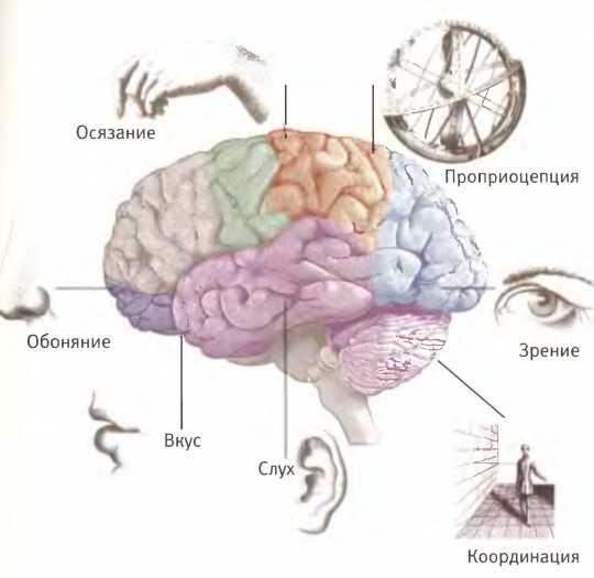 Почти вся кора больших полушарий задействована в обработке сенсорной информации: только кора лобных долей выполняет функции, не связанные с работой органов чувств. Каждым чувством занимаются свои части мозга. Схема их расположения и устройства более или менее одинакова у всех, но усиленное использование какого-то одного чувства может приводить к расширению соответствующей зоны коры, точно так же, как упражнение мышц может приводить к их росту.