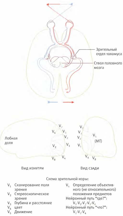 Затем информация передается по зрительному тракту в латеральное коленчатое тело, часть таламуса. Оно перенаправляет эту информацию в зону V1, расположенную в затылочной части мозга. Зрительная кора разделена на целый ряд зон, каждая из которых обрабатывает свой аспект видимого: цвета, формы, размеры и так далее.