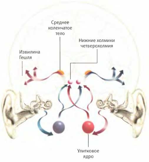 Нейронные пути, передающие информацию о звуках в разные части мозга.