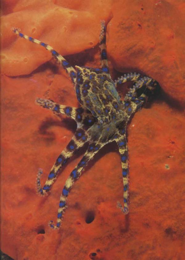 Тело осьминога не защищено панцирем, но это не мешает ему легко ловить крабов и других ракообразных. Добыча намертво захватывается щупальцами, а острыми ротовыми пластинами наносится ядовитый укус.