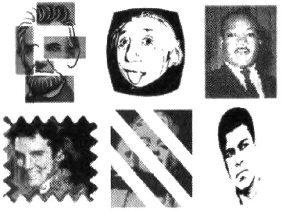 Вы, безусловно, смогли их узнать, хотя фотографии частично скрыты или искажены. Это пример иллюстрирует важнейшую способность человеческого мозга: мы можем распознавать рисунок, даже если воспринимаем (видим, слышим, чувствуем) лишь его часть и даже если он в некоторой степени изменен. Наша способность к распознаванию образов, по-видимому, опирается на инвариантные фрагменты рисунка — характеристики, которые не изменяются в условиях реальных вариаций. Видимые искажения, свойственные карикатуре или некоторым видам живописи (например, импрессионизму), подчеркивают характеристики образа (человека или объекта), который мы узнаем даже при изменении других деталей. В настоящее время искусство опережает науку в определении способностей человеческого восприятия. Тот же механизм мы используем, когда узнаём мелодию всего по нескольким нотам.