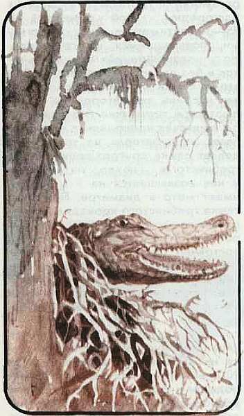 Вот в таких ямах и живут со своими матерями маленькие крокодильчики. Впрочем, маленькие они только первое время — крокодилы вырастают быстро и растут всю жизнь. Только после 20–30 лет их рост сильно замедляется. К году-полутора они уже достигают метровой длины. Теперь уж никто, кроме человека, им не страшен, и они отправляются искать не обжитые еще аллигаторами места. Если находят — захватывают территорию по 20–40 гектаров и бдительно охраняют ее: самцы — от самцов, самки — от самок. Представителям другого пола границу территорий переходить разрешается. Правда, если пруд небольшой, в нем живет либо один взрослый аллигатор (самка или самец), либо самка с выводком, либо несколько молодых, еще не расселившихся крокодилов.