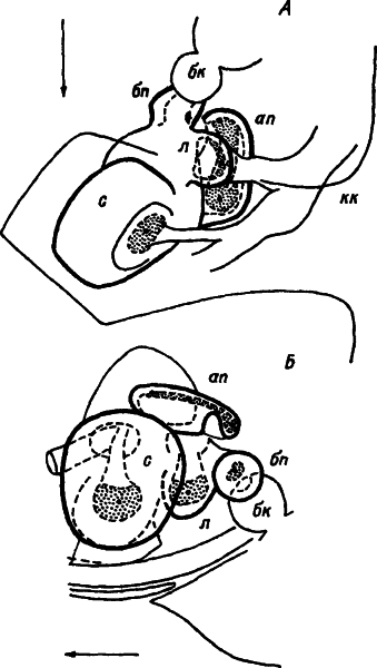 А — вид снизу, Б — с латеральной стороны. Стрелки — направление вперед; площади, заполненные точками, — места рецепторных образований, ап — амфибиальная папилла, бп — базилярная папилла, бк — базилярный канал, кк — клиновидная кость, л — лагена, с — саккулюс. Папиллы, саккулюс и лагена — рецепторные образования лабиринта.
