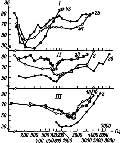 По оси абсцисс — частота звука, Гц, по оси ординат — интенсивность звука, дБ относительно уровня 2·10 Н/м2. Римскими цифрами обозначены три группы нейронов. Арабские цифры соответствуют номерам представленных нейронов из всех обследованных.
