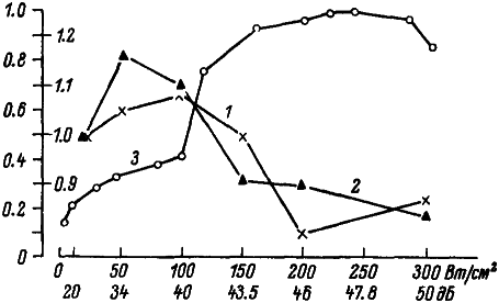 По оси абсцисс верхний ряд цифр — интенсивность ультразвука, Вт/см2, нижний ряд — то же, дБ над порогом суммарных электрических ответов (сэо), по оси ординат внутренний ряд цифр — величина показателей нуклеиновых кислот и объема ядер, за единицу принята величина до воздействия фокусированным ультразвуком, наружный ряд цифр — величина сэо за единицу принята максимальная амплитуда позитивного компонента. 1 — нуклеиновые кислоты, 2 — объем ядер, 3 — суммарные электрические ответы. Частота ультразвука — 2.34 МГц, длительность импульсов — 1 мс, частота следования импульсов — 25 в 1 с, время действия — 30 мин.