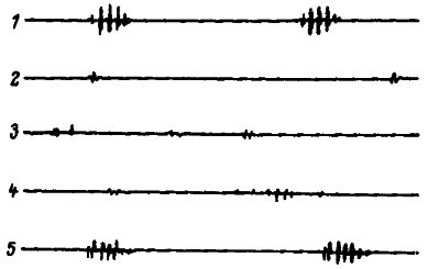 Частота ультразвука 2.34 МГц, импульсы длительностью 1 мс с частотой их следования 300 в 1 с, длительность воздействия — 22 с. Интенсивность ультразвука, осредненная по площади фокальной области, — 470 Вт/см2. 1 — «сигнал» до воздействия, 2 — через час, 3 — через два часа, 4 — через три часа, 5 — через пять часов после действия ультразвука.
