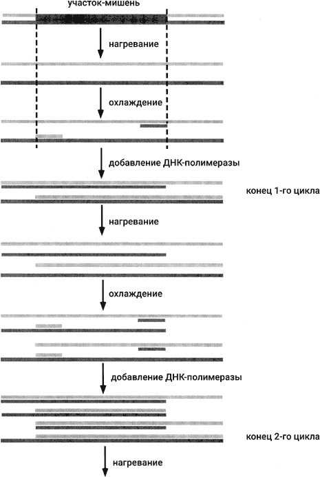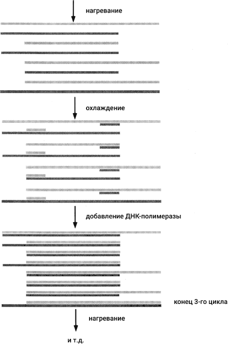 Рис. 44. Три цикла полимеразной цепной реакции (ПЦР)