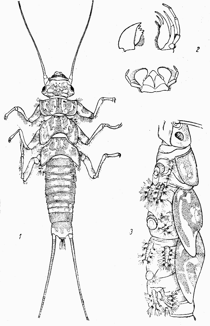 Таблица XVI. Веснянка - Perla abdominalis: Рис. 1. Нимфа 23-й стадии. - Рис. 2. Ротовые органы: жвала, нижняя челюсть и нижняя губа. - Рис. 3. Трахейные жабры взрослой нимфы.