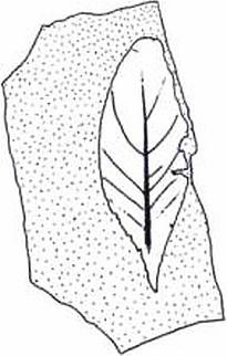 Рис. 14. Dicotylophyllum pusillum (дикотилофиллум пусиллум). Отпечаток листа одного из древнейших цветковых растений. Длина листа — 23 мм (по Вахрамееву).