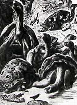 «Некоторые из местных черепах, — рассказывает Дарвин в книге, — достигают огромных размеров… М-р Лосон видел… столь крупных, что только 6–8 мужчин могли приподнять их с земли. Иные черепахи дают до 200 фунтов мяса…»