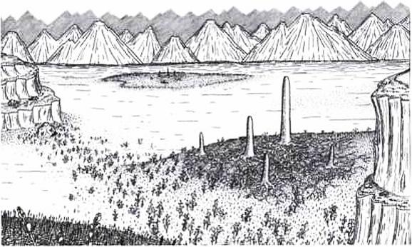 В отложениях позднего силура и девона довольно часто попадаются остатки, напоминающие окаменевшие стволы деревьев метровой толщины. Стволы эти состоят из переплетающихся между собой трубочек диаметром до семи сотых долей миллиметра. Некоторые из этих трубочек покрыты ямками, совсем как клетки древесины хвойных. Поэтому эти стволы были описаны под самостоятельным родовым названием Prototaxites (в переводе — предтиссовик), а покрытые кутикулой листоподобные пластины этого же существа — под родовым именем Nematophyton. Что представлял собой нематофитон (он же прототакситес) не ясно до сих пор. Наземную водоросль? Лишайник? Гигантский гриб? Располагались ли его стволы вертикально или лежали на земле? В любом случае, такое существо не могло не придавать ландшафту совершенно фантастический вид. Возможно, что нематофитон выглядел так, как показано на рис. 4, изображающем болото раннего девона. Тогда, видимо, не существовало ещё никаких других высших растений, кроме псилофитов. На переднем плане — заросли зостерофиллум, чуть дальше — псилофитон.