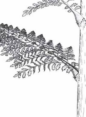 Рис. 6. Archoeopteris (археоптерис). По внешнему виду он напоминал современные хвойные, но размножался с помощью спор, как папоротник. В средней части папоротниковидного листа, вместо перышек, видны многочисленные спорангии на тонких ножках. Поздний девон.