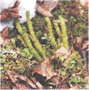 Фото 20. Lycopodium selago (плаун баранец) ранней весной. На старых, желтоватых побегах видны выводковые почки — органы вегетативного размножения. Между листьями молодых побегов — жёлтые спорангии. Подмосковье.