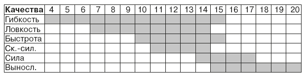 Сенситивные периоды для различных физических качеств проявляются гетерохронно, т. е. в разное время. Хотя имеются индивидуальные варианты сроков их наступления, все же в среднем можно выделить общие закономерности. Так, сенситивный период проявления различных показателей качества быстроты приходится на возраст 11–14 лет, к 15-летнему возрасту достигается его максимальный уровень. Близкая к этому картина наблюдается в онтогенезе и для проявления качеств ловкости и гибкости.