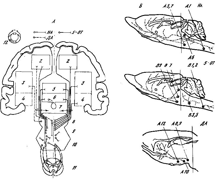 5-ОТ — серотонин; НА — норадреналин; ДА — дофамин. А — схема связей между отделами ЦНС, осуществляемых моноаминергическими нейронами: 1 — новая кора; 2 — лимбические отделы переднего мозга; 3 — неостриатум; 4 — палеостриатум; 5 — таламус; 6 — гипоталамус; 7 — медиальный пучок переднего мозга; 8 — средний мозг; 9 — варолиев мост; 10 — продолговатый мозг; 11 — спинной мозг; 12 — сетчатка [из 77]. Б — топография моноаминергических нейронов в мозге крысы (сагиттальный разрез, схема). Индексами указано принятое шведскими авторами обозначение групп моноаминергических клеток [из 161а].