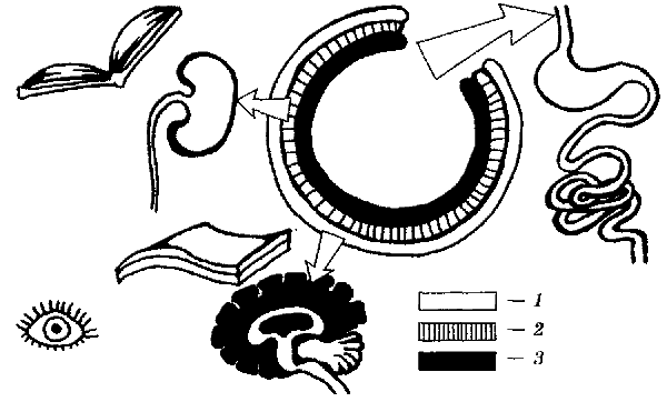 Зародышевые листки и органы, развивающиеся из них: 1 — эктодерма; 2 — мезодерма; 3 — энтодерма