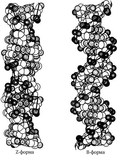 Имелся еще целый ряд принципиальных отличий этой новой структуры, названной авторами Z-формой, от В-формы ДНК. Название происходит от того, что, в отличие от В-формы, в которой сахарофосфатный остов образует плавную винтовую линию, в Z-форме эта линия имеет зигзагообразный вид (рис. 41).