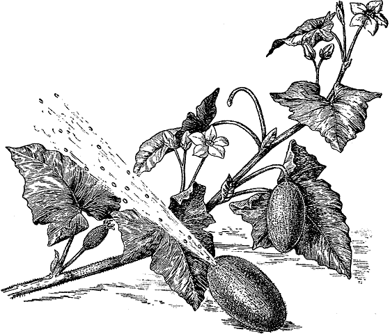 Если слегка толкнуть созревший плод бешеного огурца, он с треском отрывается от ножки и отлетает в сторону. А через дырочку из плода фонтаном вылетают в разные стороны семена вместе с жидкостью, которая их окружает.