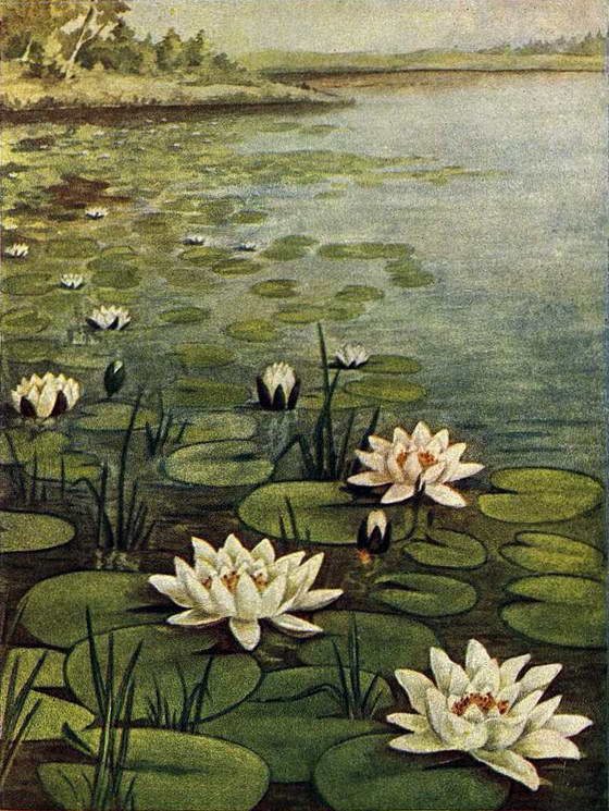 В тихих прудах или заводях живут белоснежные кувшинки; их ещё называют белыми водяными лилиями.