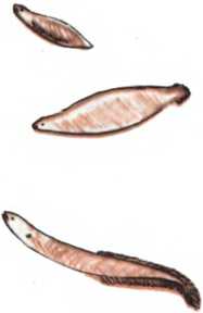 Ранней весной из икринок выклевываются личинки. Они прозрачны, имеют зубы и заостренный хвост. Постепенно личинки увеличиваются в высоту и принимают форму ивового листа. Такое строение помогает им легко держаться на поверхности и облегчает пассивное путешествие по воле течения.
