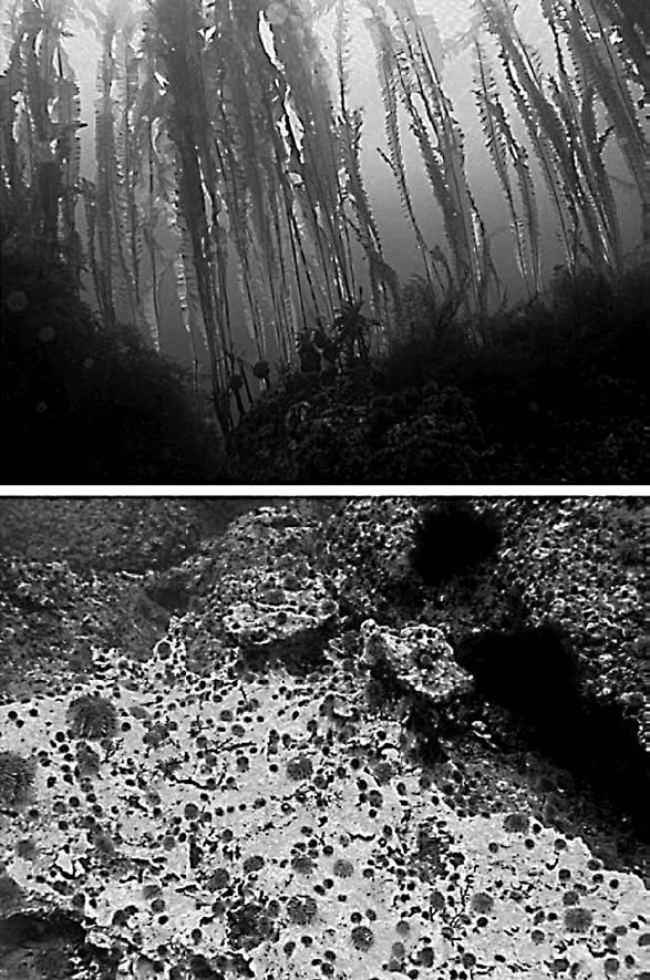 Влияние каланов на морских ежей и водорослевые леса. Вверху: при присутствии каланов численность морских ежей находится под контролем, поэтому может вырасти водорослевый лес. Внизу: при отсутствии каланов морские ежи бесконтрольно размножаются, оставляя после себя «пустоши», где нет водорослей