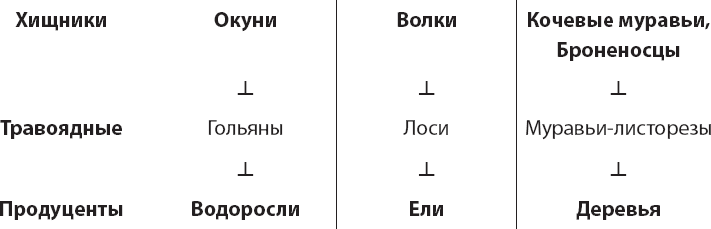 Я изобразил эти каскады так, чтобы подчеркнуть нисходящие отрицательные регуляторные взаимодействия между организмами, относящимися к разным трофическим уровням. Но должен подчеркнуть, что эта картина является весьма упрощенной, причем сразу в двух отношениях. Во-первых, большинство организмов относится не к простым линейным пищевым цепям, а, как хорошо знал Элтон, к пищевым сетям, где больше членов и взаимодействий. Во-вторых, все экосистемы в определенной степени подвергаются восходящей положительной регуляции. Без солнца не было бы зеленых растений, без растений не было бы пищи для травоядных, без травоядных не было бы добычи для хищников. Однако принципиальный прорыв, совершенный ХСС и Пэйном, заключался в следующем: они смогли буквально перевернуть традиционный ход рассуждений и открыть сильное косвенное воздействие хищников на продуцентов.