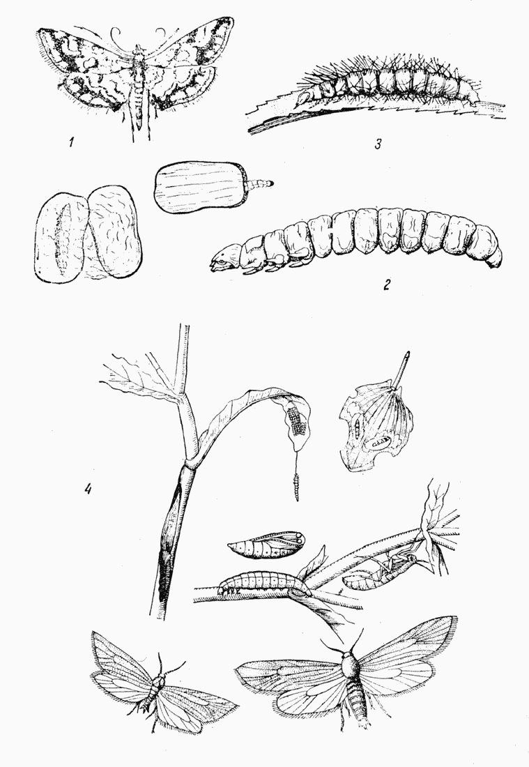 Таблица XLVII: Рис. 1. Бабочка кувшинница (Nymphula nymphaeata), имаго и личинка в домике. - Рис. 2. Личинка кувшинницы. - Рис. 3. Личинка парапоникс (Paraponyx stratiotata) (по Ламперту). - Рис. 4. Ацентропус (Acentropus niveus), яйца, личинка, куколка и imago, самец (слева), крылатая самка и бескрылая самка.