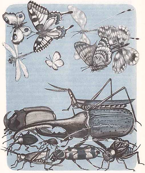 А теперь познакомимся с самими насекомыми. Класс насекомых состоит из отрядов. Представь себе, что мы принимаем парад — перед нами, отряд за отрядом, проходит армия шестиногих. Конечно, всех насекомых на этом параде нам не увидеть — ведь их сейчас, как ты знаешь, известно примерно миллион видов. Если хоть один представитель каждого вида будет пролетать или пробегать, проползать или проскакивать перед нами в течение хотя бы минуты (надо же его хоть чуть-чуть разглядеть!), то нам придется принимать этот парад круглые сутки, не отвлекаясь на еду и на сон, чуть ли не 2 года. Поэтому перед нами пройдут далеко не все насекомые, даже не все отряды. Пройдут лишь очень немногие, лишь те, которые либо чаще других встречаются, либо чем-то очень уж интересны, либо имеющие особенно большое значение в жизни людей.