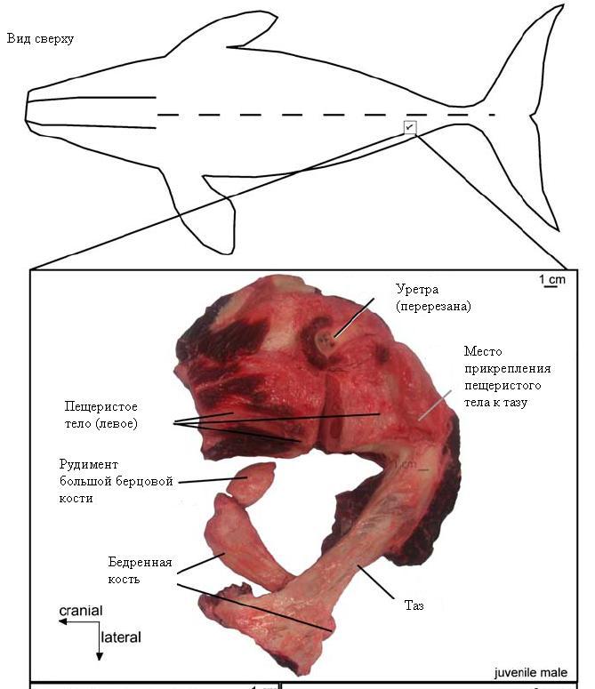 Рудименты таза и костей задней конечности у молодого самца гренландского кита (Balaena mysticetus). Из статьи Thewissen et al., 2009. From Land to Water: the Origin of Whales, Dolphins, and Porpoises.