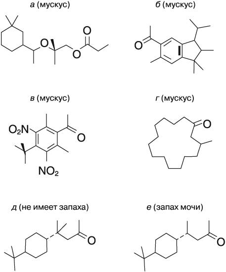 Пожалуй, одним из самых зловещих запахов в истории человечества был запах горчицы или гнилого сена в траншеях времен Первой мировой войны. Невидимые газы беспрепятственно распространялись над нейтральной зоной. В воздухе едва уловимо чувствовался запах горчицы (иприт, или горчичный газ) или затхлого сена (фосген) — и у солдата оставались несколько драгоценных секунд на то, чтобы натянуть маску, пока смертельно опасное вещество не проникло в легкие. Химик Малкольм Дайсон выжил после химической атаки ипритом. Возможно, благодаря тому, что именно обоняние спасло его от смерти, он впоследствии решил посвятить себя разгадке природы запахов. После войны он занимался промышленным синтезом многих веществ и часто пользовался обонянием, анализируя запахи продуктов реакций синтеза. Дайсона поражало очевидное отсутствие какой-либо связи между формой молекул и их запахами. Так, многие молекулы, отличающиеся по форме (вещества на рис. 5.2, а — г), пахнут одинаково, в данном случае мускусом[69]. И наоборот, вещества со схожей молекулярной структурой (д и е на рис. 5.2) имеют различные запахи, в данном случае вещество е обладает запахом мочи, а вещество д вообще не имеет запаха[70].