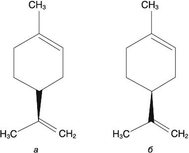 Рис. 5.3. Лимонен (а) и дипептен (б) — зеркальные изомеры с различными запахами. Молекулы различаются только направлениями нижних химических групп, которые на схеме обозначены затемненными стрелками (стрелка указывает вниз на схеме молекулы лимонена и вверх на схеме молекулы дипентена). Разумеется, молекулу дипентена можно перевернуть так, что данная химическая группа будет направлена вниз, как в молекуле лимонена, однако в этом случае двойная связь молекулы также поменяет расположение и окажется слева, а не справа, поэтому в структуре двух молекул все равно останутся различия. Подобные изомеры напоминают перчатки из одной пары