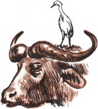 Буйволов обслуживают также белые цапли. Как рассказывают африканские охотники, не редко можно увидеть буйволов, у которых на спине сидят несколько этих красивых белых птиц.