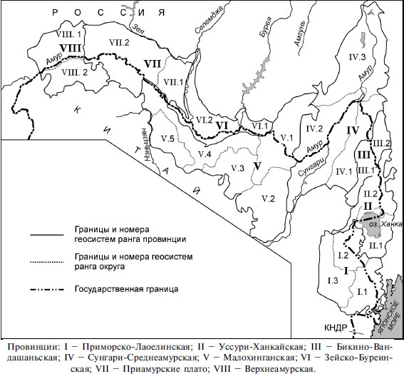 Нами было проведено комплексное природное районирование приграничных территорий юга Дальнего Востока России и северо-восточных районов КНР [Ganzei, Mishina, 2002; Мишина, Ганзей, 2004]. Выявление границ таких геосистем осуществлялось с использованием двухрядной классификации геосистем В. Б. Сочавы [1972, 1978], позволяющей рассматривать территорию с позиции как типологического (геомеры), так и с позиции индивидуально-регионального (геохоры) подходов. При этом, по мнению В. С. Михеева [2001], применение двухрядной классификационной системы снимает разрыв между типологическим и региональным уровнями геосистем. Такая система обладает строгой иерархической организацией, основана на пространственно-динамических соотношениях, что очень важно при оценке экологического состояния территории, прогнозе изменений функционирования геосистем.