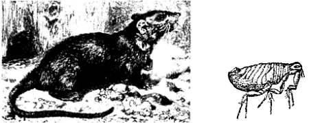 Черная или чердачная крыса (Rattus rattus), бывшая, вероятно, разносчиком Черной смерти в Европе (Ричард Лидеккер "Новая естественная история") Справа: крысиная блоха (Xenopsylla cheopis), переносящая чуму от животного к человеку