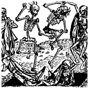 Старинная гравюра, вероятно, изображающая "танец смерти", исполняемый умирающими от чумы.