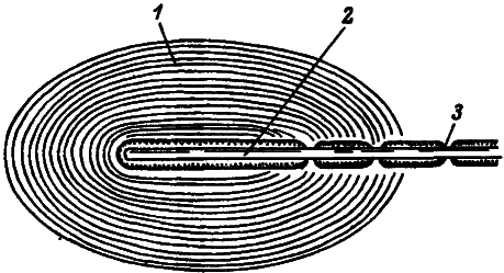 1 — капсула, 2 — чувствительное окончание, 3 — перехват Ранвье. Капсула имеет слоистое строение, а центральный стержень, представляющий собой чувствительное нервное волокно, со всех сторон «одет» в капсулу