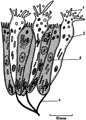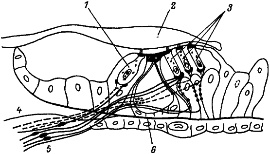 1 — реснички, 2 — рецепторные клетки с аксонами (4), окруженные опорными клетками (3).