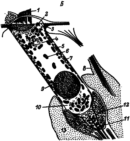 А: 1 — рецепторная клетка, 2 — окончания чувствительного нерва. Прерывистые линии обозначают электрический ток, идущий при стимуляции. Б: 1 — стереоцилии — волоски на рецепторной поверхности клетки, 2 — базальное тельце волоска киноцилии, 3 — ретикулярная мембрана, 4 — пластинчатое тельце, 5 — плазматическая мембрана клетки, 6 — митохондрия, 7 — субмембранные пластинки, 8 — пальцевидный отросток, 9 — ядро, 10 — тельце Рециуса с множеством митохондрий, 11 — афферентное (передающее к мозгу) нервное окончание, 12 — эфферентное (передающее в клетку) нервное окончание, 13 — опорная клетка Дейтерса, от которой к поверхности кортиевого органа идет пальцевидный отросток.