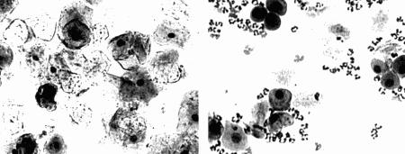Вагинальные выделения кошки (а). Выделения, типичные для фазы эструса. Большая часть клеток представляет собой безъядерные кератинизированные клетки или клетки с пикнотическим ядром. Присутствуют промежуточные клетки (b). Выделения, характерные для метэструса, — «течки», иногда наблюдаемой у кошек в конце эструса. Присутствуют поверхностные и промежуточные клетки, повышено содержание лейкоцитов. Этот короткий метэструс наблюдается в течение 24–48 часов (см. Приложение)