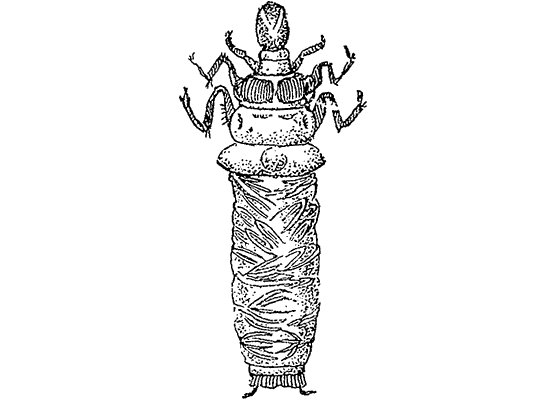 Личинку можно выгнать из ее домика: поталкивать тупой палочкой или головкой булавки через заднее отверстие домика. Потревоженная личинка выползет.