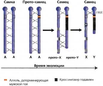 На ранних этапах эволюции два пола могли различаться лишь по одному, аутосомному локусу, когда один пол (обозначаемый как протомужской) гетерозиготен по этому локусу, а другой пол (протоженский) гомозиготен. «Аллель, детерминирующая мужской пол», показана желтым цветом. Если для спаривания необходима одна особь каждого пола, тогда особи, гомозиготные по аллели, детерминирующей мужской пол, не могут возникать. На этой ранней стадии физиологические различия между полами будут еще слабыми, сравнимыми с различиями между двумя типами спаривания у дрожжей. Для предотвращения образования интерсексуальных состояний кроссинговер в локусе, определяющем мужской пол, и вокруг него будет подавлен (эти подавленные области показаны темным цветом) В пределах этого района будут накапливаться мутации, потому что подавление кроссинговера уменьшит их способность распространяться по популяции и, отсюда, давление отбора против них. Район дегенерации, в котором кроссинговер подавлен, будет постепенно расширяться («храповик Меллера»), пока эта хромосома не утратит большую часть своих активных, функциональных генов. Должен остаться небольшой, активный участок, гомологичный Х-хромосоме, для того, чтобы разрешить спаривание и кроссинговер при мейозе. Это псевдоаутосомный район (PAR, pseudoautosomal region). Аутосома, первоначально гомологичная будущей Y («А» на диаграмме), будет сама эволюировать в основном путем транслокаций с других аутосом. в конечном счете формируя отличающуюся Х-хромосому. Эта Х-хромосома, подобно другим хромосомам, представляет собой мозаику из фрагментов ДНК, помещенных на место в разные периоды на протяжении эволюции; некоторые из них являются древними, а некоторые относительно недавние. Это иллюстрируется по-разному расположенными пэтчами на прото-Х- и Х-хромосомах На Х-хромосоме человека более недавние участки обогащены генами, избежавшими инактивации X