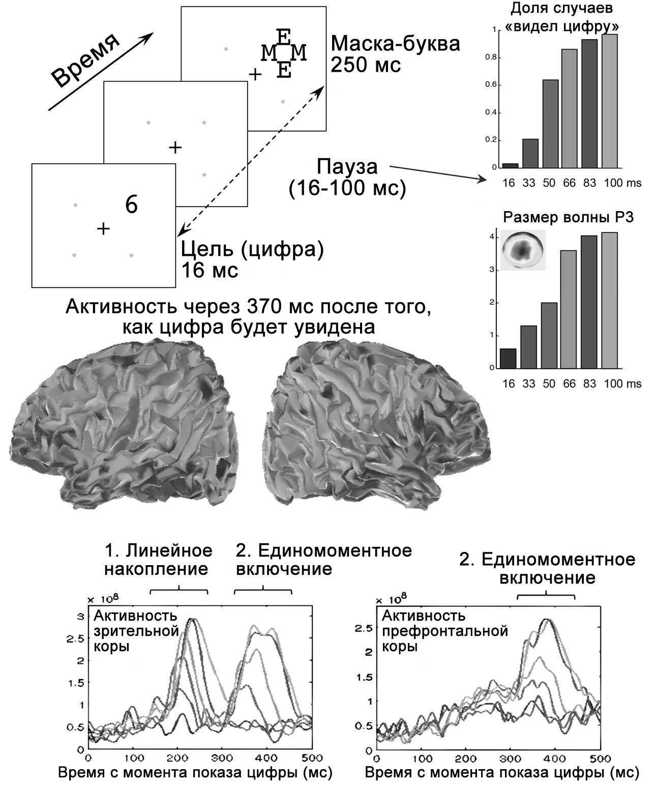 Возникающие далее волны в левой и правой зрительных областях тоже не менялись. Степень зрительной активации росла пропорционально длительности демонстрации цифры на экране до появления маски. Мимолетно продемонстрированная цифра могла проникать в мозг до тех пор, пока этот процесс не пресекала маска из букв. Поэтому получалось, что длительность и размеры мозговых волн менялись в строгом соответствии с тем, сколько времени проходило между показом цифры и наложением маски из букв. Эта пропорциональность реакции никак не сочеталась с ответами участников, утверждавших, что они либо видели цифру, либо нет. По-видимому, волны были слишком слабы и не могли достичь сознания участников. На этом этапе сильная активность сохранялась даже тогда, когда люди утверждали, что не видели никаких цифр.