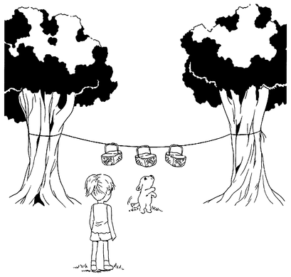 Эксперименты показывают, что собаки намеренно пользуются визуальными жестами, чтобы сообщать о своих желаниях в новых контекстах. Когда мы осознали, насколько хорошо Орео понимает, что мы пытаемся ему сказать, то стали удивляться тому, как много он способен сообщить нам. Так, я натянул веревку между двумя деревьями на заднем дворе у моих родителей и повесил на нее три плетеные корзины. Потом попросил Кевина, моего младшего брата, спрятать еду в одну из них, пока я сам был в доме. Корзины висели высоко, и Орео не мог достать из них лакомство.