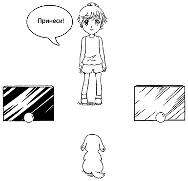 На основании этих результатов были поставлены другие эксперименты, призванные проверить, насколько собаки учитывают нашу область видимости. Мы, кстати, все время обращаем внимание на область видимости других людей. Если кто-то попросит у вас ручку, то вы сделаете логический вывод, что этот человек заметил ручку у вас в руке, хотя вы вполне можете видеть и другую ручку, которая лежит на полу за спиной у просящего. Учитывая область видимости другого, я могу догадаться об ответе, если сам пока не вижу, что у меня просят. Достаточно обратить внимание, куда сейчас смотрит сам просящий. Для таких суждений с учетом области видимости я вынужден отказаться от эгоцентрического взгляда на мир и подумать о том, что видят и чего не могут видеть мои собеседники.