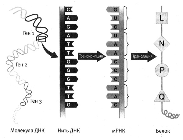 Связь между кодом ДНК и последовательностью белка была установлена примерно 40 лет назад, когда биологи расшифровали генетический код. Декодирование ДНК и построение белка осуществляются в два этапа. На первом этапе последовательность оснований одной нити ДНК транскрибируется в последовательность РНК, называемую матричной (или информационной) РНК (мРНК). Затем, на второй стадии, мРНК транслируется в аминокислотную последовательность, из которой формируется белок. В клетках генетический код считывается (с транскрипта мРНК) триплетами, каждый из которых определяет одну аминокислоту (короткий пример представлен в правой части рис. 3.2).