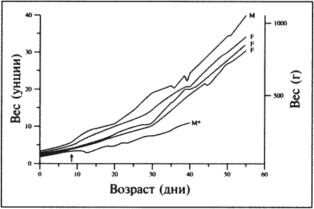 М — самцы, F — самки. М* — котенок (самец), отстававший в весе от остальных котят, начиная с 8-дневного возраста. Несмотря на проведенное лечение погиб. Посмертное исследование выявило наличие абсцессов в легких