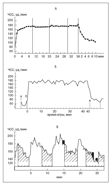 Рис. 25. Частоты сердечных сокращений при работе постоянной мощности бег на 10 км (А) и при работе переменной мощности – игра в футбол (Б) и волейбол (В)